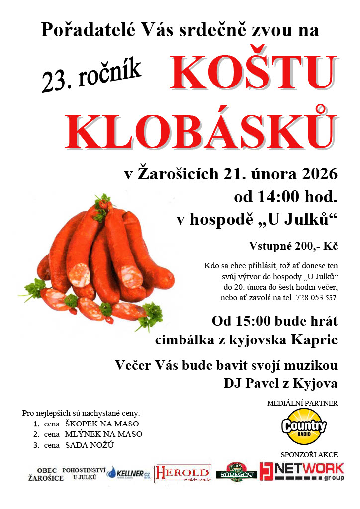Zveme Vás na 3. ročník koštu klobásků, který se koná v Žarošicích. Akce začíná 21. února 2026 v 14:00 hodin v hospodě „U Julků“. K účasti se můžete přihlásit přinesením svého výtvoru nebo telefonicky. Od 15:00 hodin zahraje cimbálka Kapric a večer Vás pobaví DJ Pavel.