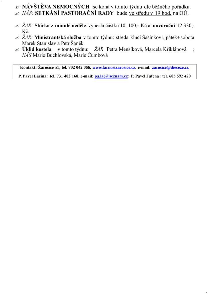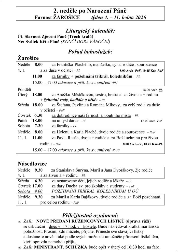 2. neděle po Narození Páně Farnost ŽAROŠICE týden 4. – 11. ledna 2026 Liturgický kalendář: Út: Slavnost Zjevení Páně (Třech králů) Ne: Svátek Křtu Páně (KONČÍ DOBA VÁNOČNÍ) Pořad bohoslužeb: Žarošice Neděle 8.00 za Františka Plachého, manželku, syna, rodiče, so