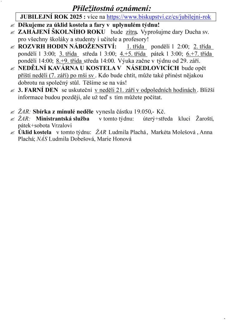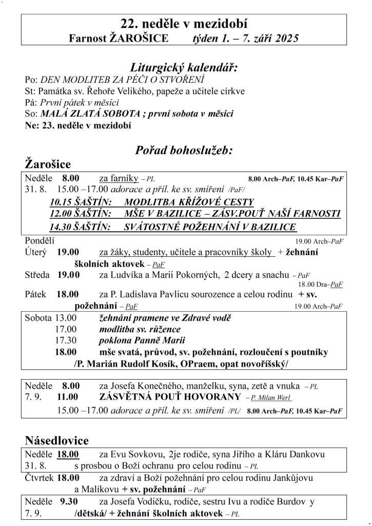 Farnost ŽAROŠICE týden 1. – 7. září 2025