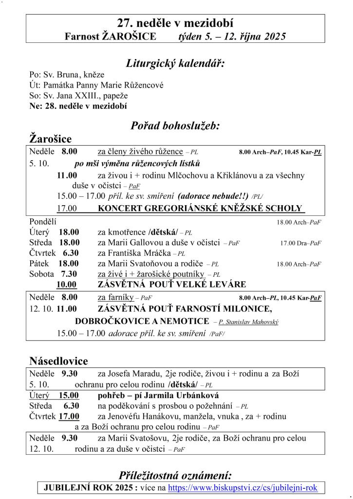 27. neděle v mezidobí Farnost ŽAROŠICE týden 5. – 12. října 2025 Liturgický kalendář: Po: Sv. Bruna, kněze Út: Památka Panny Marie Růžencové So: Sv. Jana XXIII., papeže Ne: 28. neděle v mezidobí Pořad bohoslužeb: Žarošice Neděle 8.00 za členy živého růžence –