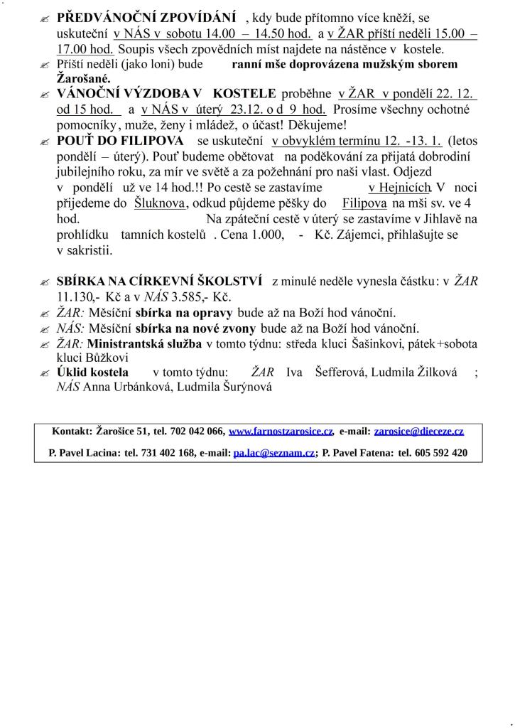 3. neděle adventní Farnost ŽAROŠICE týden 14. – 21. prosince 2025 Liturgický kalendář: Od 17. do 24. prosince prožíváme předvánoční týden. Ne 21. 12.: 4. neděle adventní Pořad bohoslužeb: Žarošice Neděle 8.00 za Elišku Konečnou, manžela, syna, zetě a vnuka – PL
