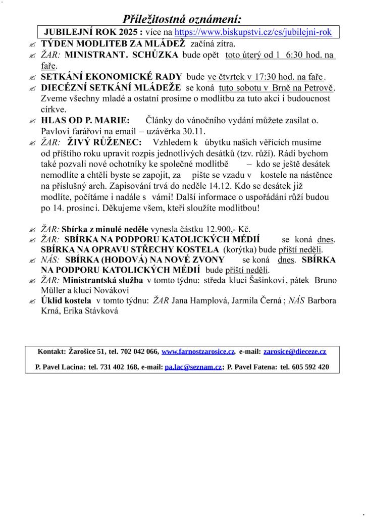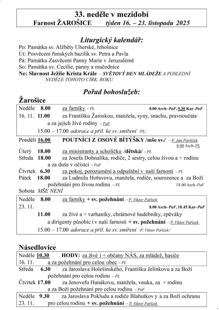 Farnost ŽAROŠICE týden 16. – 23. listopadu 2025