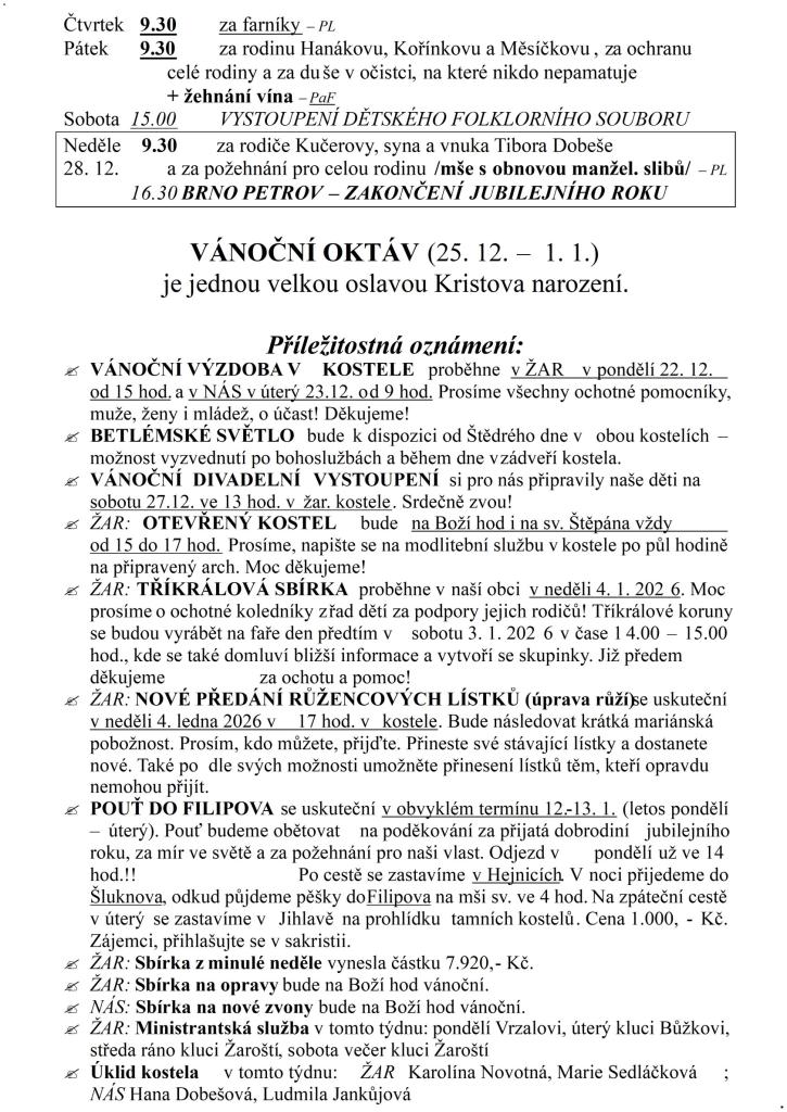 Farnost ŽAROŠICE týden 21. – 28. prosince 2025
