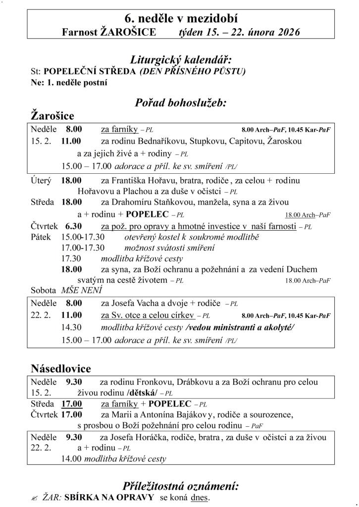6. neděle v mezidobí Farnost ŽAROŠICE týden 15. – 22. února 2026 Liturgický kalendář: St: POPELEČNÍ STŘEDA (DEN PŘÍSNÉHO PŮSTU) Ne: 1. neděle postní Pořad bohoslužeb: Žarošice Neděle 8.00 za farníky – PL 8.00 Arch–PaF, 10.45 Kar-PaF 15. 2. 11.00 za rodin