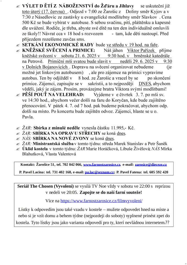 Slavnost Nejsvětější Trojice Farnost ŽAROŠICE týden 15. – 22. června 2025 Liturgický kalendář: Čt: Sv. Jana Nepomuckého Neumanna, biskupa So: Památka sv. Aloise Gonzagy, řeholníka Ne: Slavnost Těla a Krve Páně (Boží Tělo) Pořad bohoslužeb: Žarošice