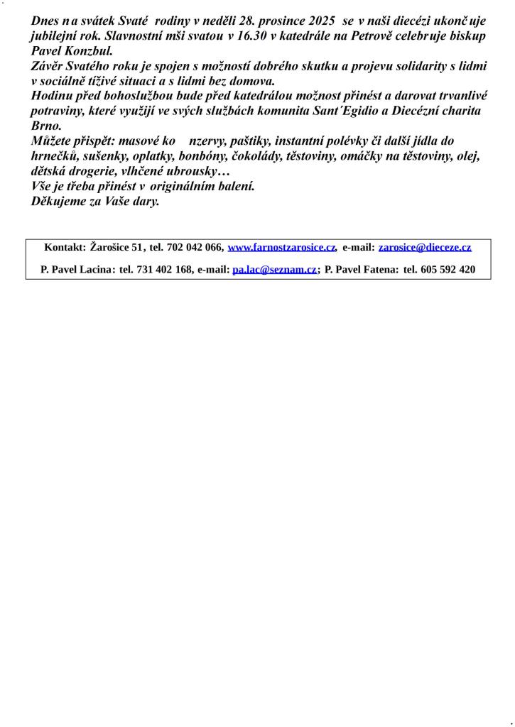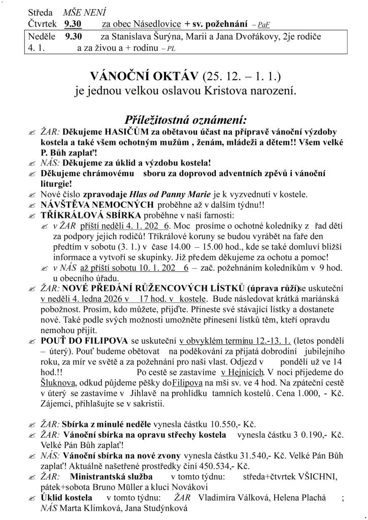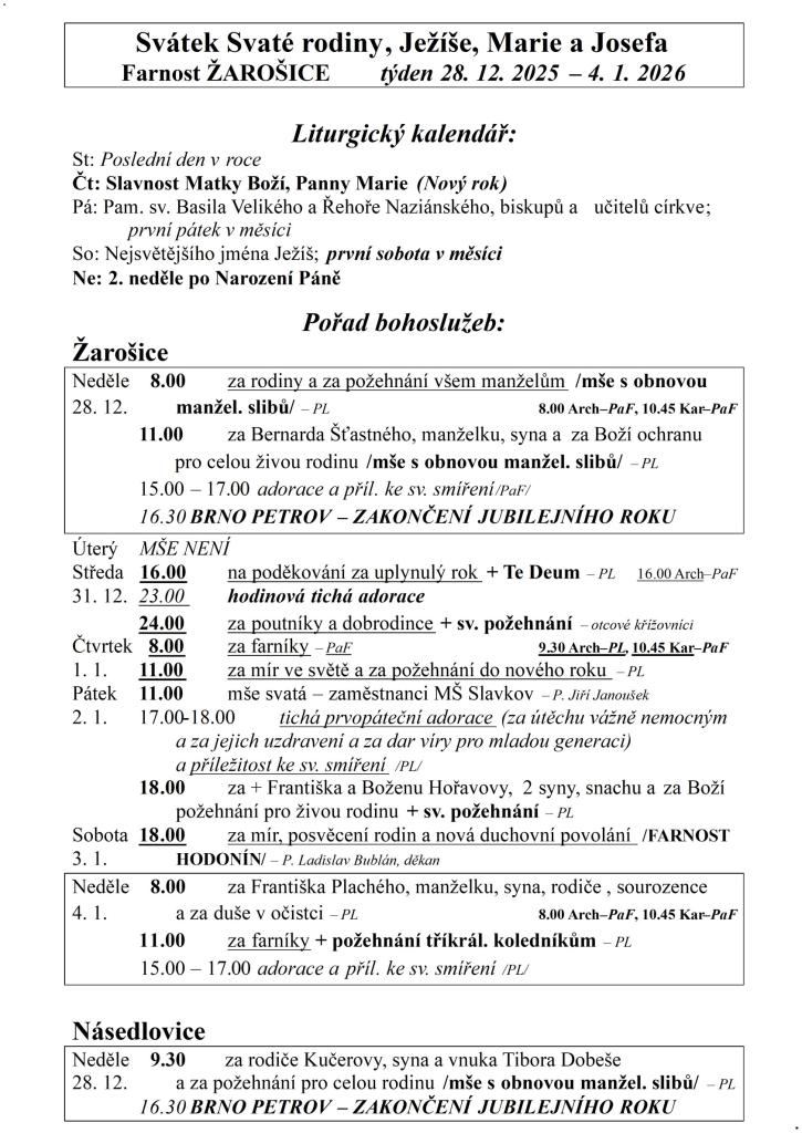Farnost ŽAROŠICE týden 28. 12. 2025 – 4. 1. 2026