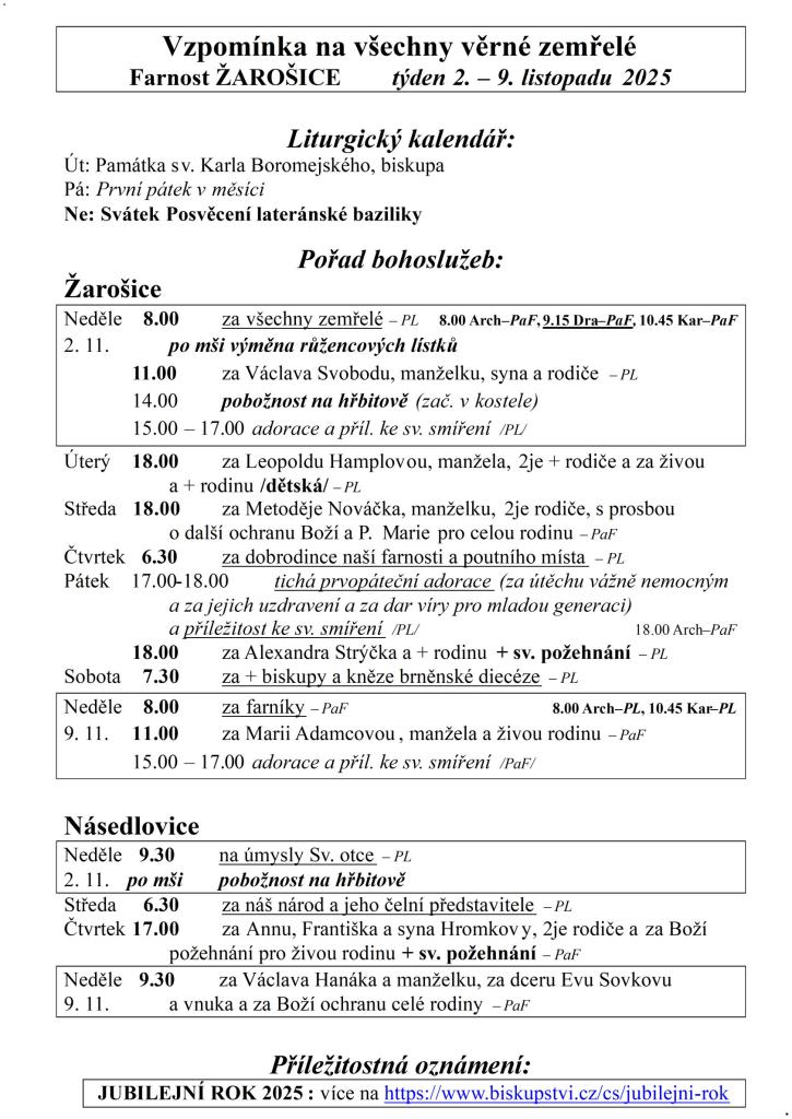 Vzpomínka na všechny věrné zemřelé Farnost ŽAROŠICE týden 2. – 9. listopadu 2025 Liturgický kalendář: Út: Památka sv. Karla Boromejského, biskupa Pá: První pátek v měsíci Ne: Svátek Posvěcení lateránské baziliky Pořad bohoslužeb: Žarošice Neděle 8.00 za všechn